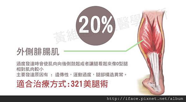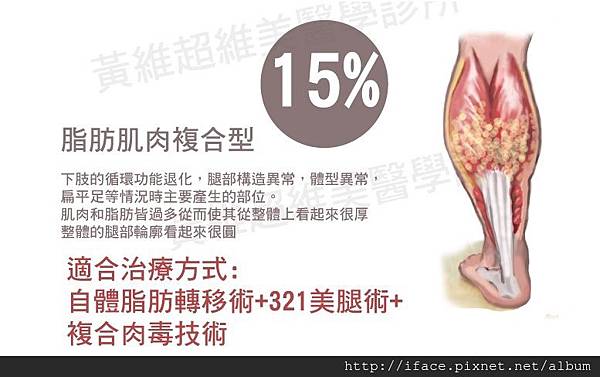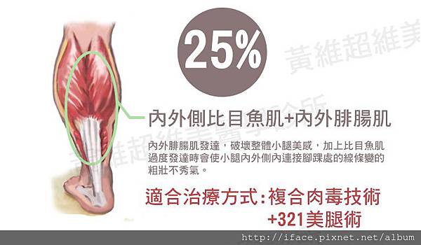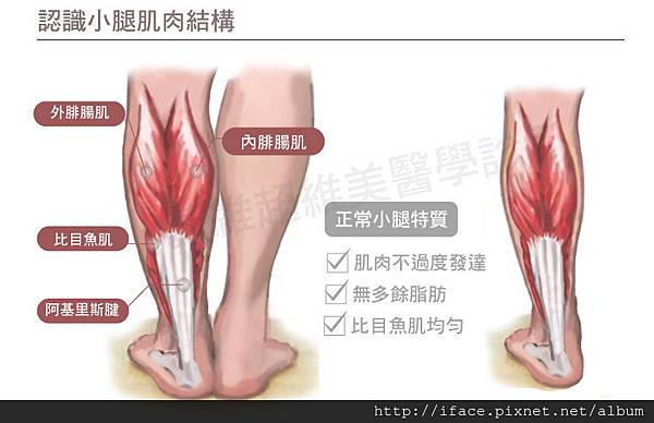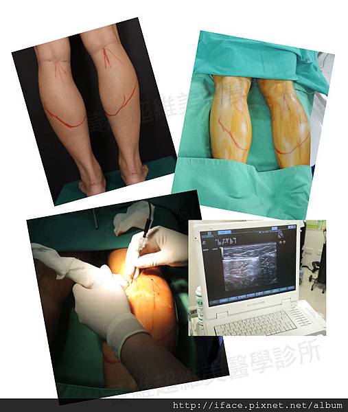 | 優缺點 | 安全,無恢復期,但需重複施打,花費高。 | 術中無痛,術後無疤,恢復期短,手術約2-3小時 | 長疤痕,恢復其長,小腿有變形危險,耗費時間長。 | 疼痛、肌肉纖維化,嚴重者可能影響步行。 | 有疤痕,深層肌肉的形狀會顯現,以及外側肌肉代償情形。 |