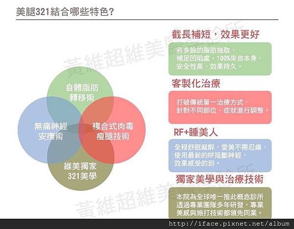 | 項目 | 肉毒桿菌注射 | WEE電波纖纖美腿術 | 腓腸肌切除 | 腿雕術 | 神經切除 |