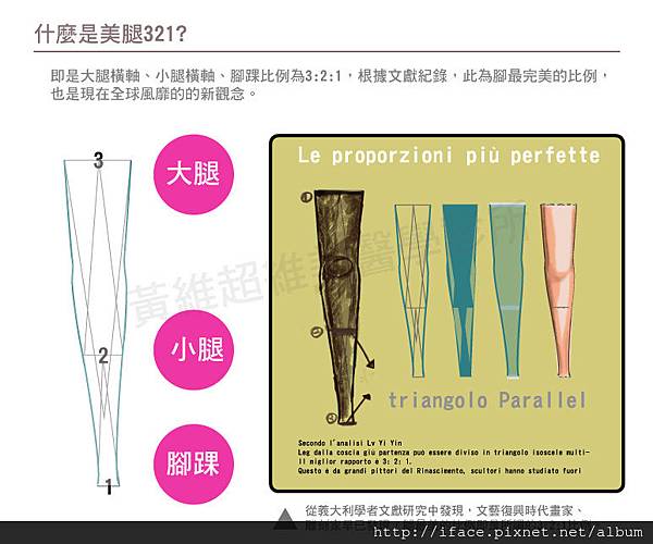 即是大腿橫軸、小腿橫軸、腳踝比例為3:2:1。根據文獻記錄,此為腳的最完美比例,也是現在全球風靡的新觀念。