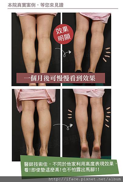 *術後因組織水腫,會感覺治療部位有加粗情形,無須過度擔心,大約2-3周時間會逐漸消腫;一般來說5-7天就會感覺突出的小腿肚肌肉開始消失,真正看到肌肉萎縮效果大概是1-2個月左右,手術的效果是維持永久性的,之後將可擁有永久定型之纖腿效果。