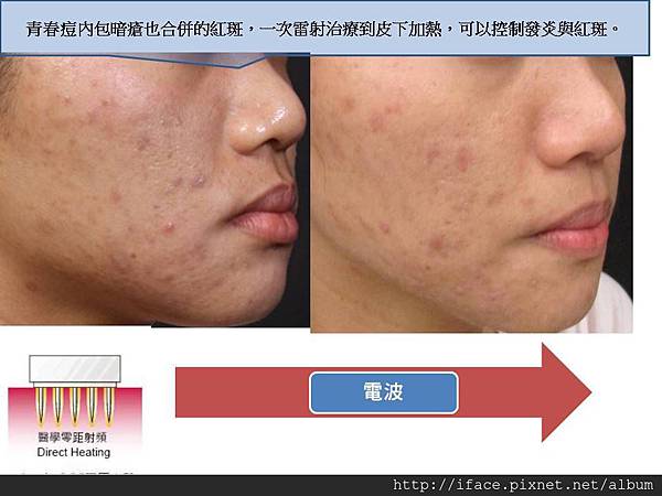 同時做到汽化、凝結、收縮三效合一,深層汽化毛囊皮脂,破壞皮脂腺、改善油脂分泌,引流成熟膿疱並控制痤瘡桿菌增生,改善痘痘發炎,降低發炎,還能刺激膠原蛋白增生,撫平肌膚、緊緻毛孔、填補痘