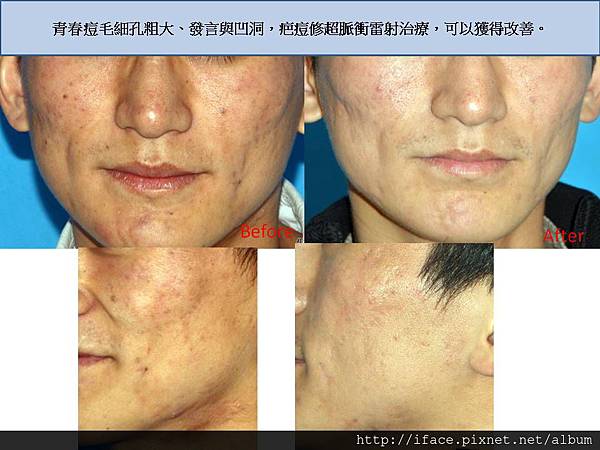 發膿性痘痘,我們以超脈衝雷射清除毛孔、排膿、預防痘疤,利用雷射光熱原理,可以排膿與殺菌,可以較快回到乾淨無瑕的臉龐。不排膿的情況反而造成更多毛囊發炎,發炎破壞到真皮層,留下凹陷性疤痕。